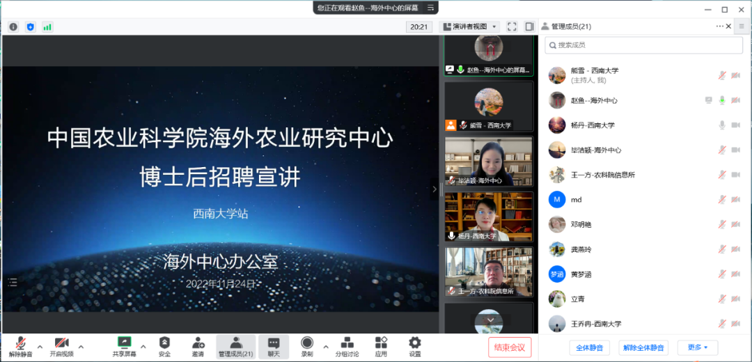 2022年11月24日下午,中国农业科公司海外农业研究中心博士后招聘宣讲会——sunbet申搏站顺利举行。中国农业科公司海外农业研究中心办公室主任毕洁颖、中国农业科公司农业信息研究所人事处副处长王一方、中国农业科公司海外农业研究中心人力资源官员赵鱼博士,sunbet申搏经济管理公司党委副书记田丽、农林经济管理系主任杨丹教授、农林经济管理系教师熊雪博士及博士研究生30余人参加了会议。宣讲会由杨丹主持。
