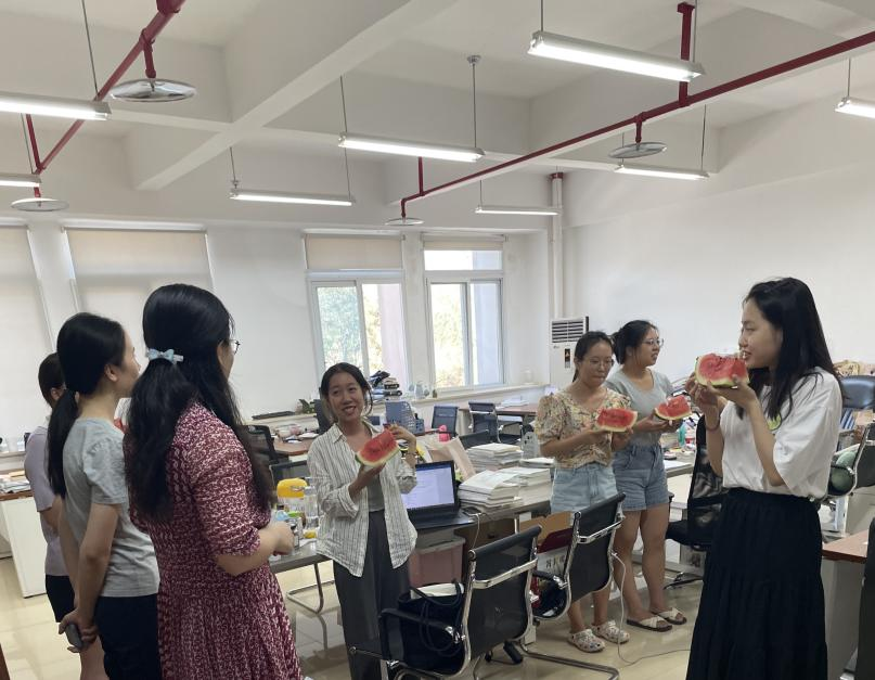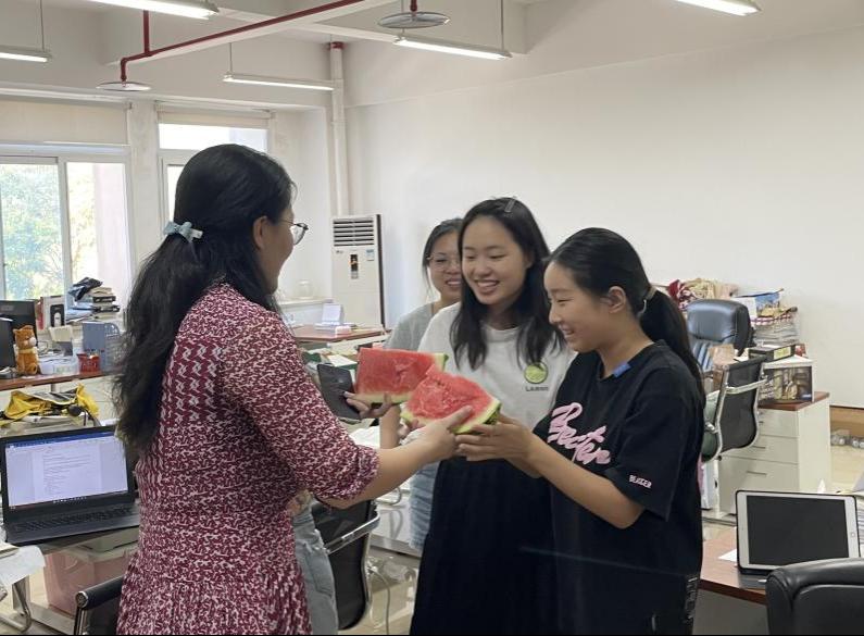 在各个自习室,田丽为同学们分发西瓜、冷饮,与同学们进行亲切交谈。她关切地询问同学们留校的学习和生活情况,仔细聆听同学们各方面的需求,对大家在炎热夏天仍然潜心科研和坚持学习的态度表示了肯定。她叮嘱同学们在紧张的学习之余,也要科学安排时间,合理饮食和作息,做好防暑降温工作。同学们对公司的关心和关怀表示衷心地感谢,大家纷纷表示,他们将坚定信念,认真学习,朝着既定目标奋勇前行,不辜负公司的殷切期望。