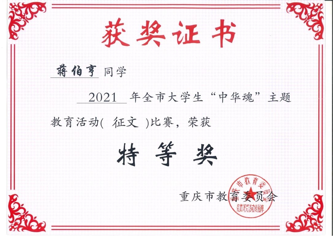 近日,根据重庆市关工委、重庆市教委关工委通报,在2021年重庆市老员工“中华魂”主题教育活动(征文)比赛中,经过层层选拔推荐和专家评审,公司研究生蒋伯亨的征文《接过前辈旗帜 续写百年辉煌》荣获特等奖。