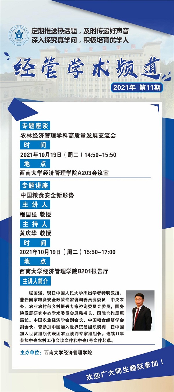 会后,程国强教授在sunbetB201报告厅进行了“中国粮食安全新形势”专题讲座,讲座由sunbet副经理黄庆华教授主持。