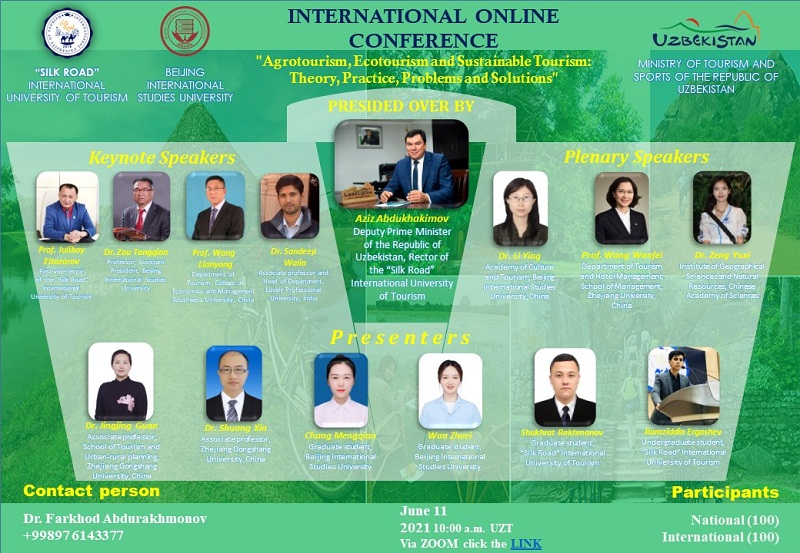 6月11日,乌兹别克斯坦丝绸之路国际旅游大学和中国北京第二外国语公司联合发起“农业旅游、生态旅游和可持续旅游——理论、实践、问题与解决方案”国际学术论坛。乌兹别克斯坦共和国副总理Aziz Abdukhakimovz致开幕词。乌方的丝绸之路国际旅游大学董事长Juliboy Eltazarov教授、中方的北京第二外国语公司旅游公司经理邹统钎教授、sunbet王连勇教授做主旨演讲。