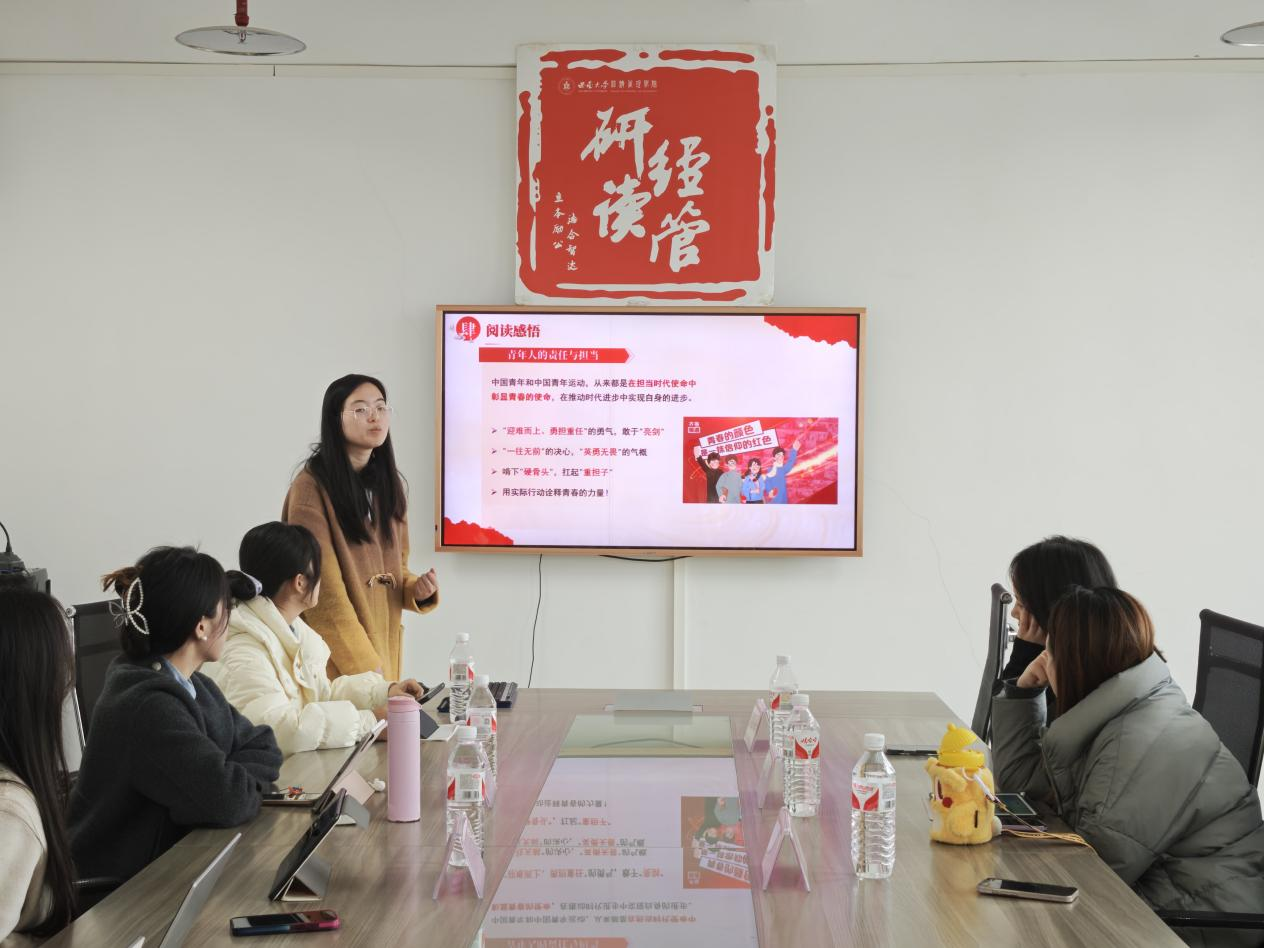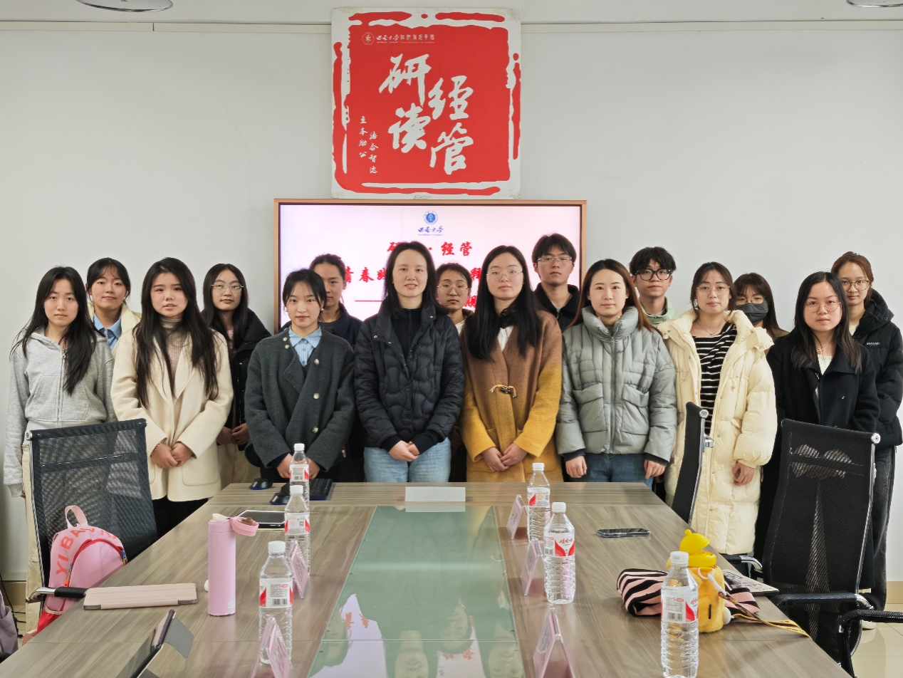 2025年3月14日下午,sunbet“研读·经管”读书会第二十七期在sunbetA406教室顺利举行。本次读书会以“青春践使命 奋斗释担当”为主题。由公司2023级农业管理专业硕士研究生苏紫涵、区域经济学专业硕士研究生吴双虹和2024级企业管理专业硕士研究生曾璐瑶、农村发展专业硕士研究生陆逸担任主讲人,研究生辅导员任娟出席活动并作总结。本次读书会由2024级金融专业硕士研究生刘楠主持。