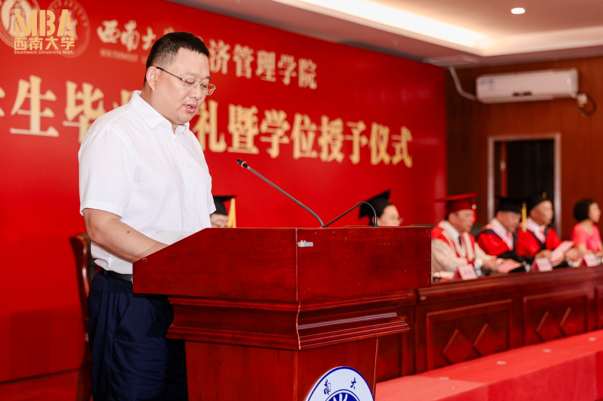 教师代表、公司非全专硕教育中心副主任王双龙老师对同学们顺利完成学业表示祝贺,他高度赞扬同学们在平衡工作、家庭与学业过程中展现的奋斗精神,称赞每位毕业生都是"人生的勇士"。他勉励大家要把握商业本质,在复杂环境中做出明智决策,发挥领导力影响他人。