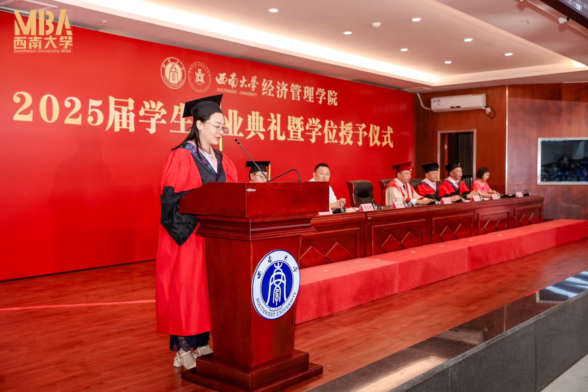 毕业生代表2022级智达班的张艾琦同学在毕业典礼上分享了三年来兼顾工作、家庭与学业的奋斗时光。他回顾了在职攻读MBA的艰辛与成长,坦言在职场拼搏、育儿责任与学业压力中不断突破自我,最终完成蜕变。