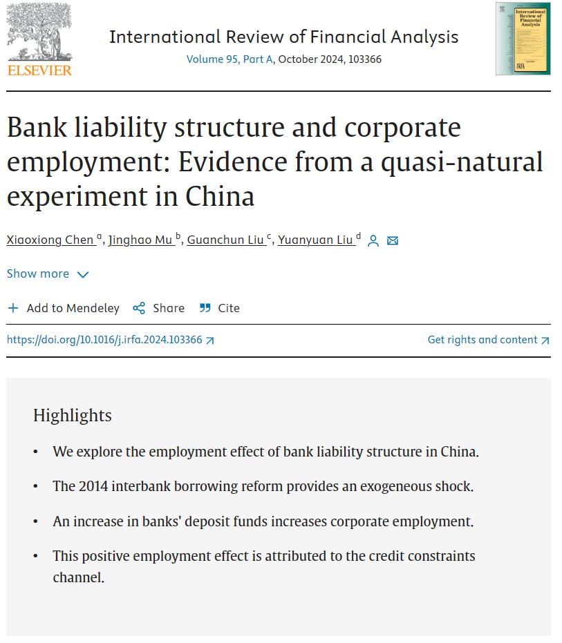 Chen, X., Mu, J., Liu, G., and Liu, Y. (2024). Bank liability structure and corporate employment: Evidence from a quasi-natural experiment in China. International Review of Financial Analysis, 95, 103366.