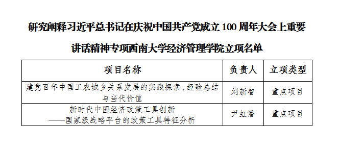 据悉,重庆市教育委员会公布了“研究阐释习近平总书记在庆祝中国共产党成立100周年大会上重要讲话精神专项”立项名单。公司刘新智、尹虹潘两位教师喜获重点项目立项。