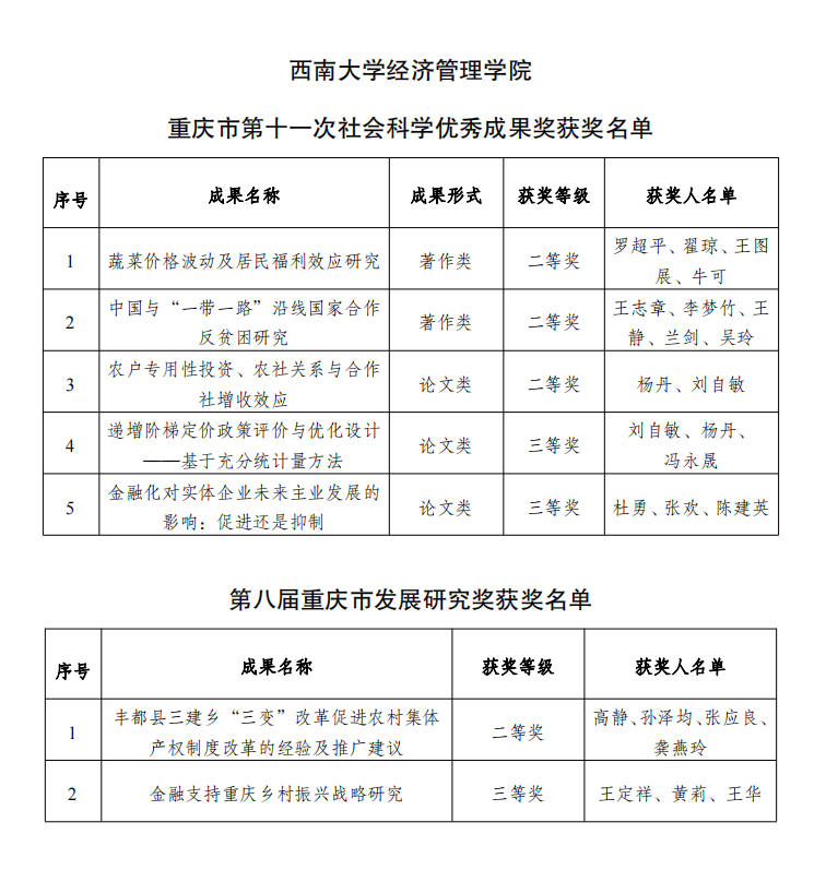 近日,重庆市人民政府办公厅印发了《重庆市人民政府关于表彰重庆市第十一次社会科学优秀成果和第八届重庆市发展研究奖成果的决定》,公司共有7项科研成果获奖,其中包括重庆市第十一次社会科学优秀成果奖二等奖3项、三等奖2项,第八届重庆市发展研究奖二等奖1项,三等奖1项。
