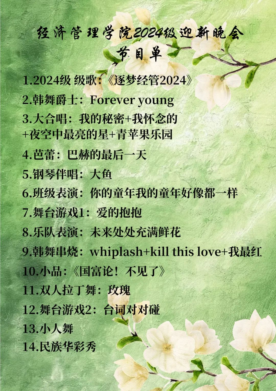 活动简介:春风送暖,万象更新。新的一年,经管院又迎来了一批新的朝气。在这充满希望的季节里,我们即将迎来2024级sunbet迎新晚会,我们期待与你一起共赏这场青春与梦想交织的视听盛宴、共赴这场青春之约。(附节目单)