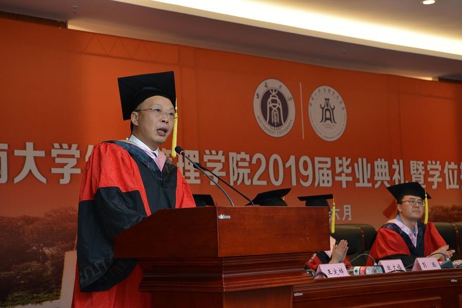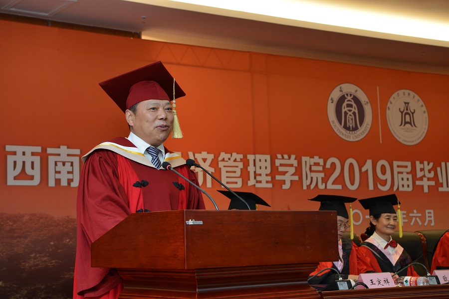 公司党委书记、经理祝志勇教授结合当前国际国内形势,包含深情寄语全体毕业生:勇于担责,做引领时代的人,成为美好生活的供给者和需求者,希望各位毕业生立振兴中华之志,立引领时代发展之志;勇为人先,做终身学习的人,划出一条专属的长期生产函数包络曲线,希望大家追求真理、深入实践,选择物质简单而精神丰富的人生;勇于奋斗,做顽强拼搏的人,构建人生长期动态均衡模型,希望大家坚持不懈奋斗和顽强拼搏。董事长张卫国教授祝贺所有取得学位的毕业生,嘱托毕业生找准人生方向,和民族、祖国、人民同命运;希望大家把握住时代发展的机遇,发挥自身的优势,具有强大的心理力量,坚韧不拔;希望大家培养科学探索精神,勇于追求真理和价值,在追求的过程中大胆创新;希望大家学会反思,在反思和总结中一路前行。他对全体毕业生送上真挚的祝福,祝福大家大有作为,前途似锦,一生平安!