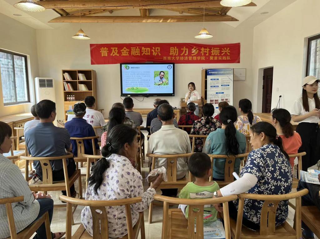 聚星实践队队员程露作为主讲人进行宣讲。她通过视频播放、知识问答等形式,向大家详细介绍如何识别非法集资、防范电信诈骗等金融知识,同时普及个人信息保护、银行卡的正确使用等各类金融知识,从多个方面提升村民的风险防范意识。