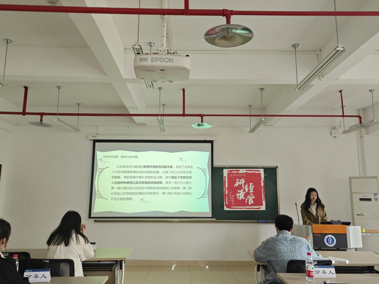谭励慧同学分享了人物书籍《我与地坛》。她以“以爱为刃,划破命运的牢笼”为主题,介绍了作者史铁生对于亲情、友情、爱情的看法。随后她通过分享书中的精彩片段,让同学们感受到了作者对生命的热爱。她认为,或许我们每个人都有自己的“地坛”,在那里,我们看向自己,面对自己。