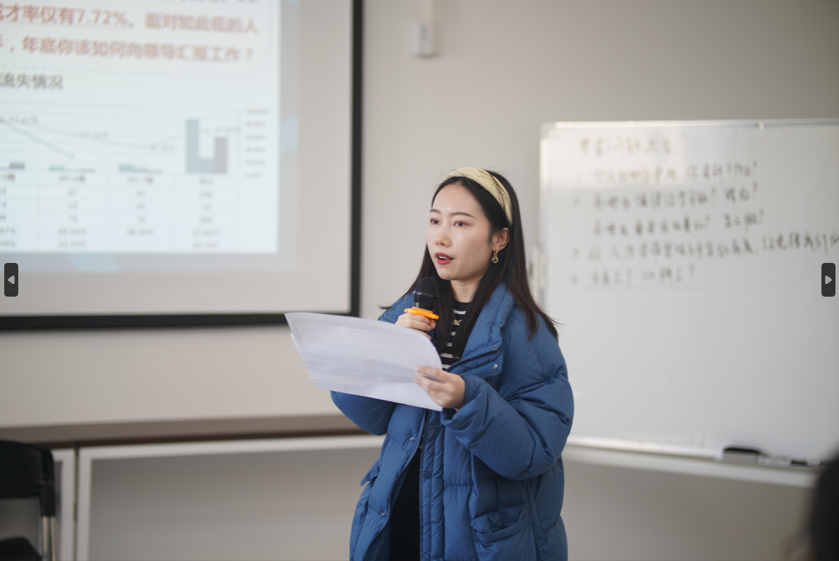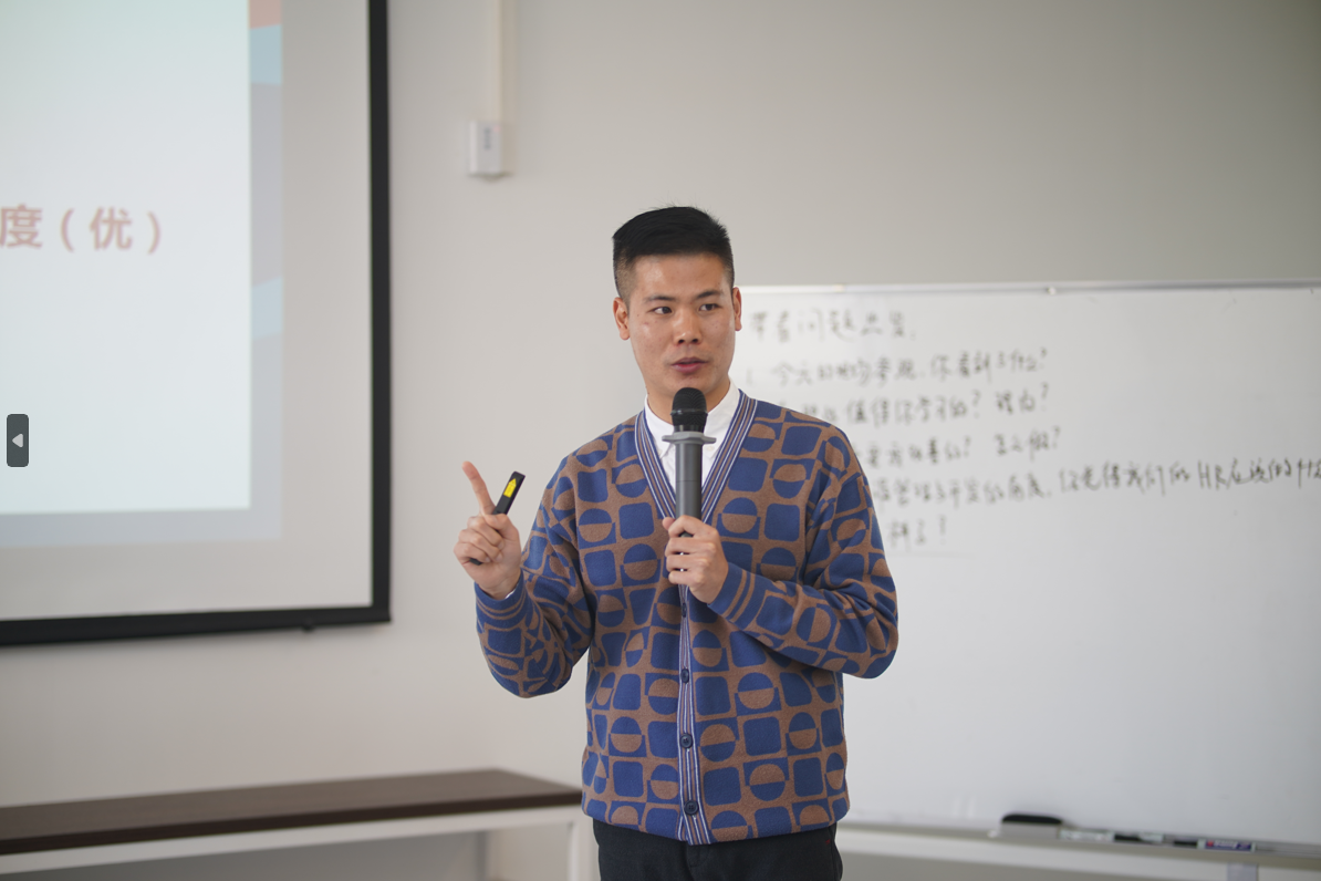 讨论结束后,总经办侯照主任以企业导师的身份,为同学们带来了《人力资源管理实践》课程。他详细阐述了公司在老员工员工培养、人才内生体系、绩效和潜力九宫格、识人用人四象限等方面的探索和实践。结合自己的工作经验,分享了许多宝贵且实用的见解,如“学会归零、以终为始”的理念。他表示,无论企业处于哪个发展阶段,关键在于人的力量。因此,在选择同行伙伴时,应优先考虑具有高潜力且认同企业文化的人。他认为,人力资源管理在现代企业中将成为更重要的因素,并呼吁管理者们“赋能新人、成就自我”,以推动企业和员工的共同成长。