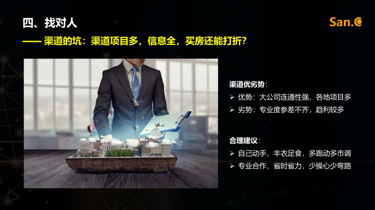 最后,找对人。这部分丰雁老师提出了在购房渠道上,对接人的专业度参差不齐且大多数人都是利益驱使者,不会将购房者的利益放在第一位。因此,建议购房者尽可能自己多跑动、多进行市场调研或者寻找专业的人或机构合作。