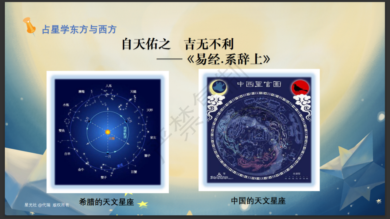代老师首先带大家回顾了东方占星学及其发展历史。通过这部分讲解,让大家了解到世界上最早的天文著作《甘石星经》,同时揭示了明朝开国皇帝朱元璋下令民间禁习天文术数,导致中国的占星术一度湮没在历史尘埃中的缘由。