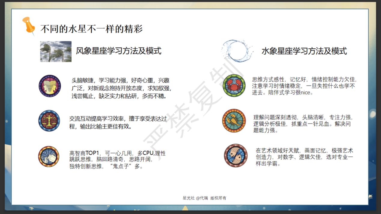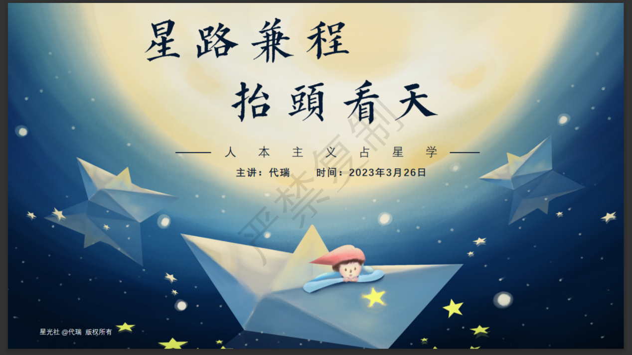 随后,代老师分享了近代占星学主流——心里占星学的由来,并通过星图普及了十二宫、常用10颗行星等知识点,带领大家进一步了解十二星座对应的四元素及特点,引出占星学在个人层面的应用,进而升华到宏观层面的应用。