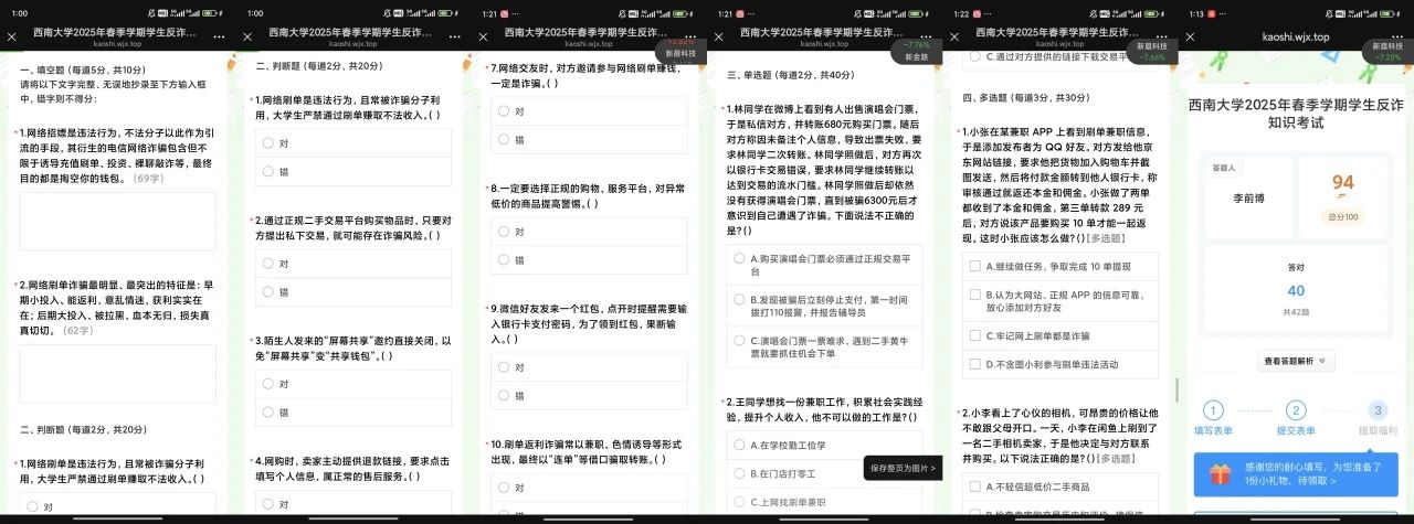 公司组织全体研究生参与反诈知识答题活动,题目聚焦电信诈骗识别技巧、紧急情况处置方法及法律常识等内容,通过单选、多选和判断题等形式检验学习成效。活动以班级为单位开展,员工通过线下集中答题巩固知识盲点,深化对诈骗手段的认知,全院研究生参与答题率达100%。参与同学反馈,答题活动形式简洁、内容实用,有效强化了日常生活中的防诈意识。