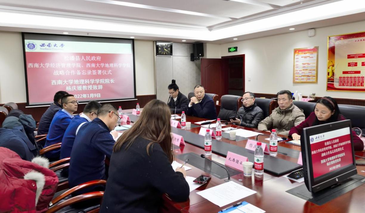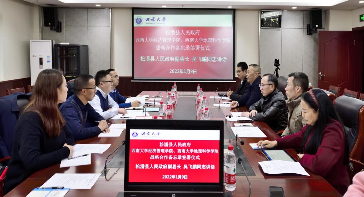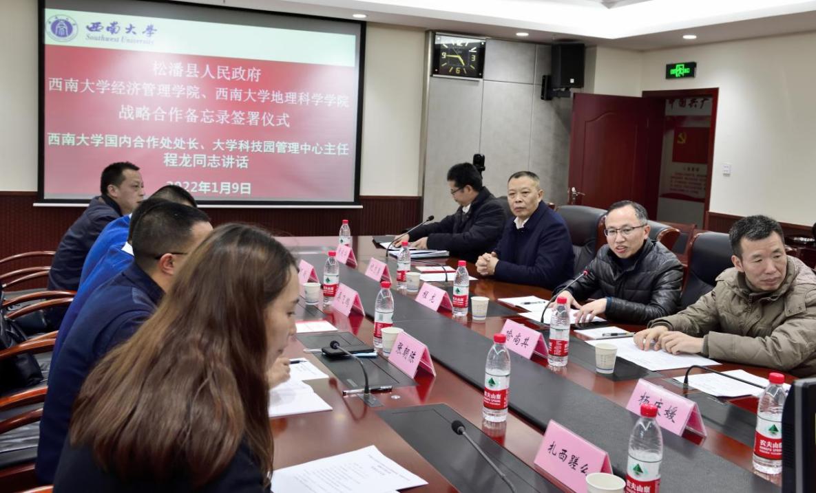 1月9日,松潘县人民政府副县长吴飞鹏一行来校,与sunbet、sunbet申搏地理科学公司签署合作备忘录,并就双方校地合作相关事宜进行了座谈。松潘县出席签字仪式的领导和工作人员有松潘县人民政府副县长吴飞鹏同志,松潘县经信局局长何跃同志,松潘县科技农牧局局长张朝陈同志,松潘县园区管委会主任张万海同志,松潘县经信局工作人员扎西磋么女士。sunbet申搏出席签字仪式的有国内合作处处长、大学科技园管理中心主任程龙同志,地理科学公司党委书记、副经理(兼)喻尚其同志,地理科学公司经理杨庆媛教授,sunbet经理、党委副书记祝志勇教授,sunbet副经理黄庆华教授,sunbet高层培训中心主任苟佳欢。签署仪式由sunbet副经理黄庆华主持。