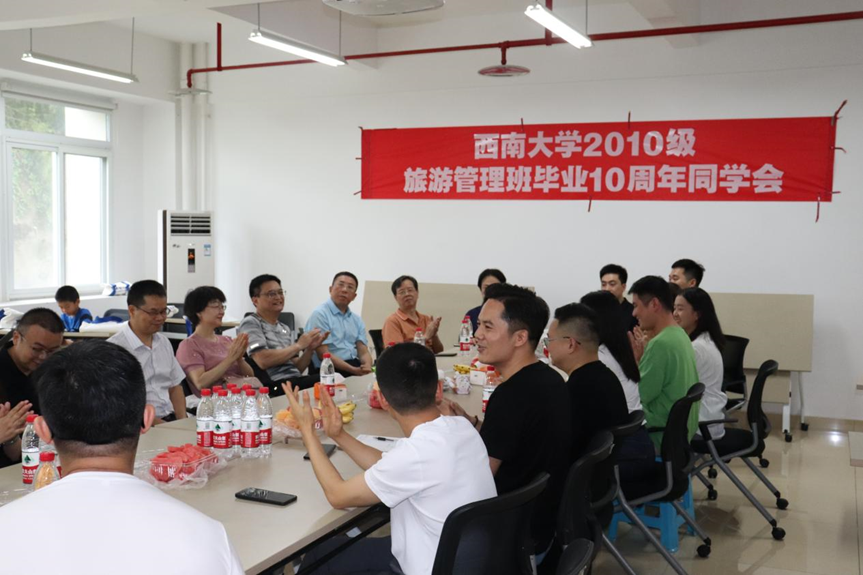 22日下午,来自重庆、四川、贵州、云南、西藏的2010级旅游管理专业员工们在公司A404教室会面,公司副经理黄庆华和旅游管理系老师与员工们相聚交流。黄庆华代表公司热烈欢迎员工们返校聚会,向员工们介绍了旅游管理专业发展概况,并对员工们表示深深的祝福。旅游管理系主任魏鹏教授代表教师讲话。员工们依次向恩师们介绍了自己的工作生活状况,并表达了对老师们的感恩之情。在自由交流环节,员工们追忆了求学时的青春时光,表达了再回母校的激动心情,期待着下一个十年再相聚。会后,员工们与参会恩师在公司大楼前合影留念。