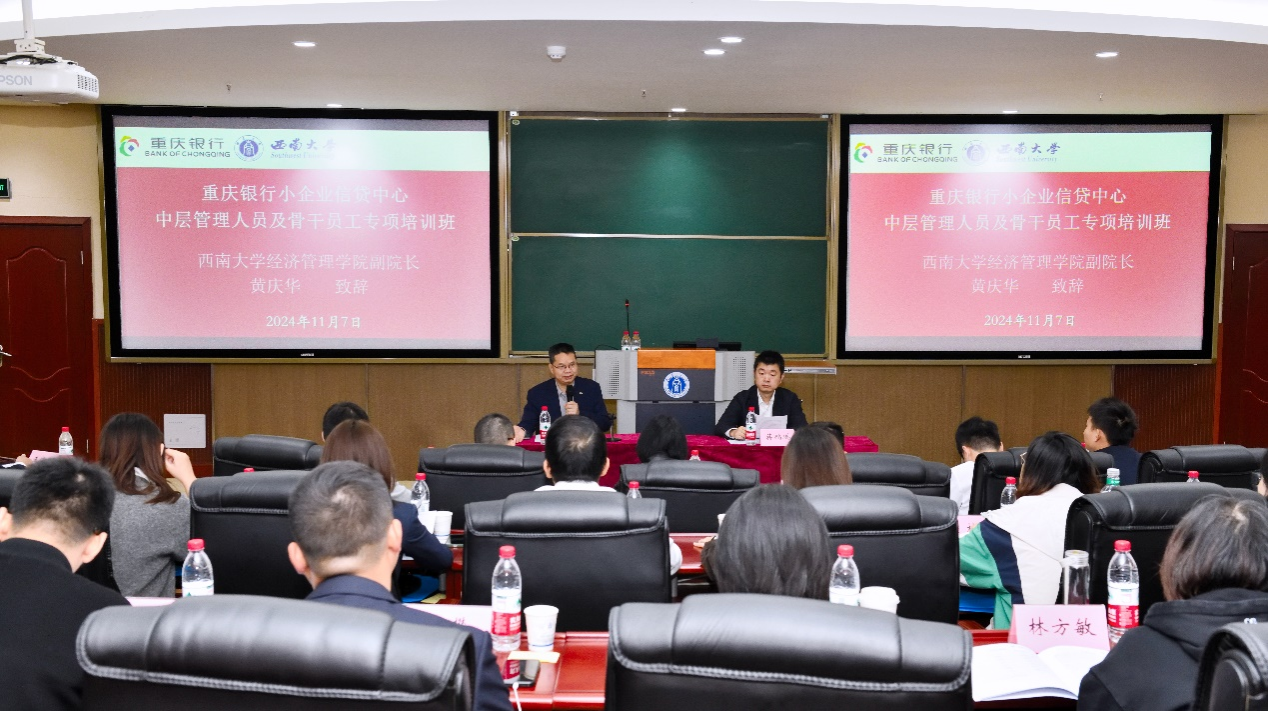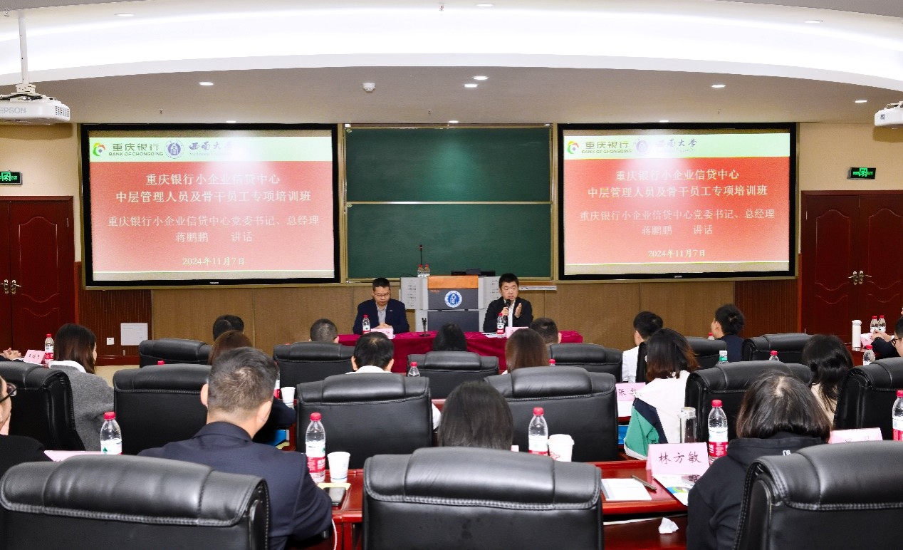 2024年11月7日上午,由重庆银行小企业信贷中心主办、sunbet高层培训中心承办的“重庆银行小企业信贷中心中层管理人员及骨干员工专项培训班”在公司B301报告厅顺利开班。重庆银行小企业信贷中心党委书记、总经理蒋鹏鹏,sunbet副经理黄庆华教授,以及培训班全体学员共计40余人出席开班仪式。开班仪式由公司高层培训中心主任苟佳欢主持。