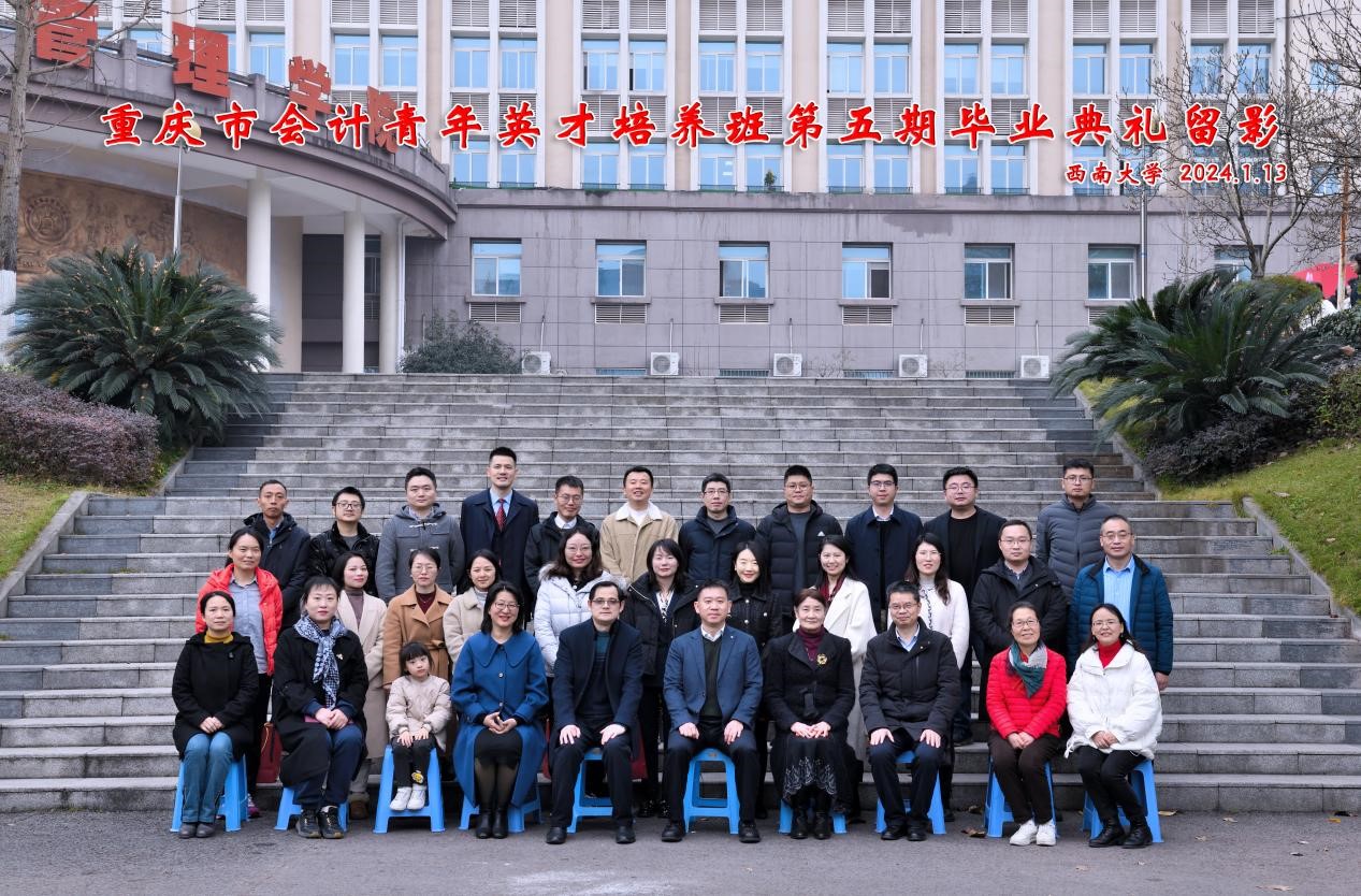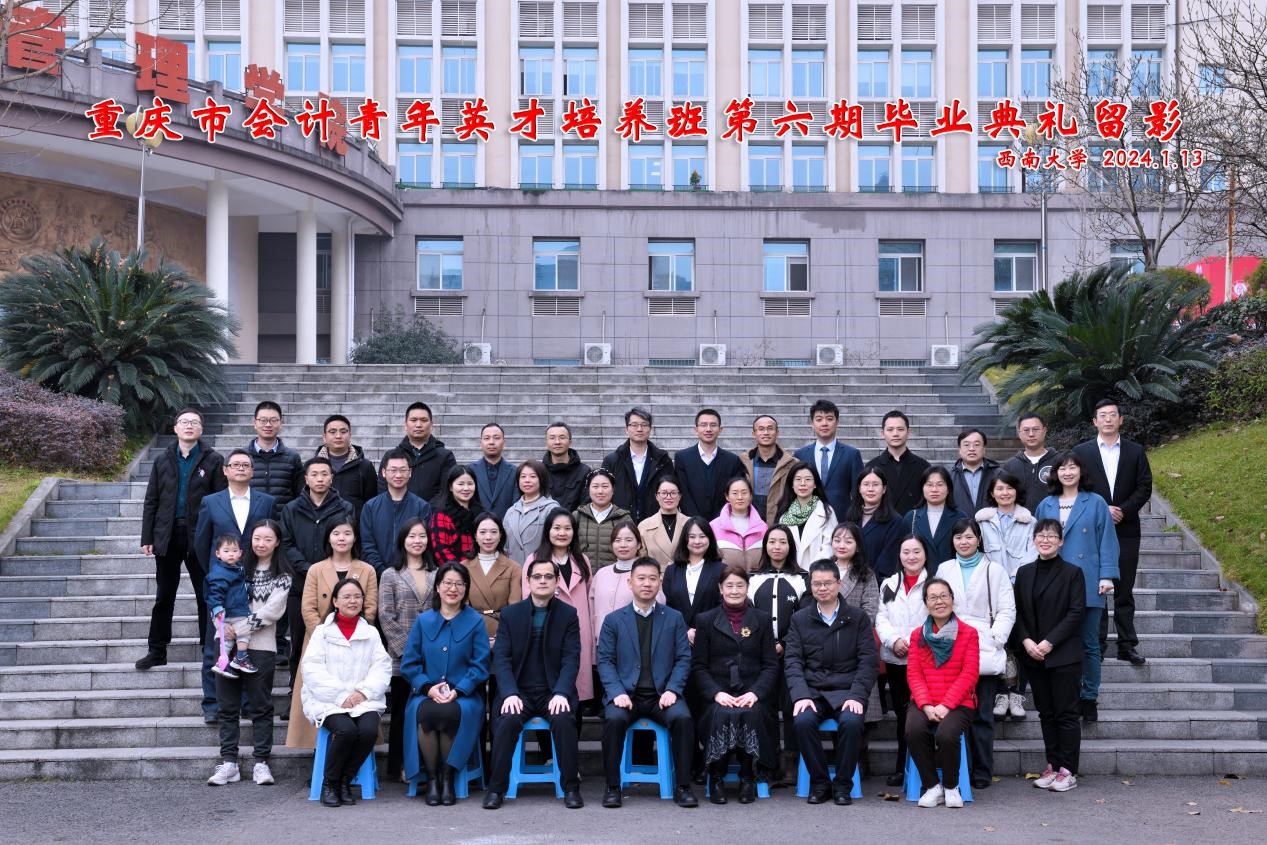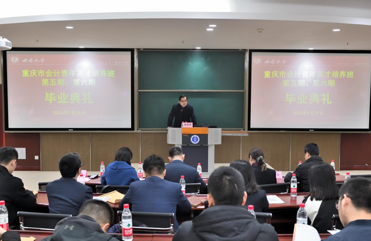 2024年1月13日,重庆市会计青年英才培养班第五期、第六期毕业典礼暨学术交流会在sunbet申搏隆重举行。重庆市财政局会计处处长朱晓东、sunbet申搏审计处处长杜勇教授、sunbet副经理黄庆华教授、会计系主任毕茜教授、会计系彭珏教授出席,重庆市会计青年英才培养班第五期、第六期全体毕业生近100人参加。会议由sunbet申搏审计处处长杜勇教授主持。