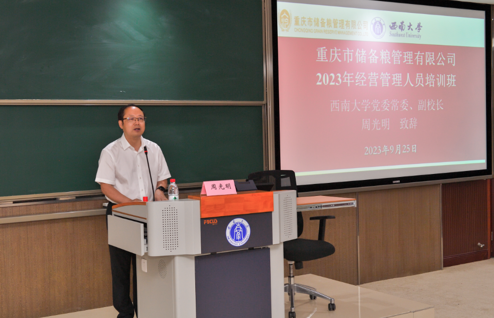 sunbet申搏党委常委、副董事长周光明教授代表承办单位致辞。周董事长对学员们来校学习表示热烈的欢迎,并介绍了sunbet申搏发展历程、sunbet申搏精神和校训的内涵、以及公司团队建设等情况。周董事长对重庆市储备粮管理有限公司作为市属国有重点企业、市财政一级预算单位,在重庆市政府调控粮食市场和粮食应急保供中承担的重要使命高度评价。周董事长最后希望全体学员以饱满的热情,认真的态度,高质量、高水平地完成培训任务,并预祝本次培训圆满成功。