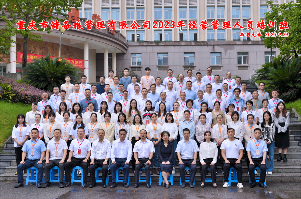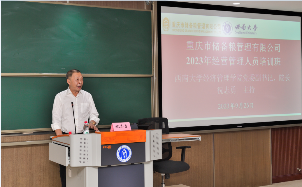 2023年9月25日上午,由重庆市储备粮管理有限公司主办、sunbet承办的“重庆市储备粮管理有限公司2023年经营管理人员培训班”在公司B301教室顺利开班。重庆市储备粮管理有限公司党委书记、董事长李桑,党委副书记、工会主席陈琳,sunbet申搏党委常委、副董事长周光明教授,经济管理公司党委副书记、经理祝志勇教授,sunbet副经理黄庆华教授,sunbet高层培训中心工作人员,全体培训班学员共计80余人出席开班仪式。开班仪式由公司党委副书记、经理祝志勇教授主持。