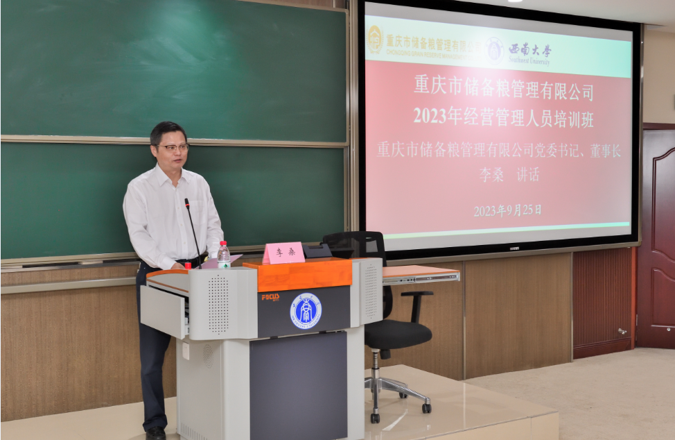重庆市储备粮管理有限公司党委书记、董事长李桑进行了开班动员讲话。李董事长对为培训班顺利开班付出辛勤劳动的sunbet申搏各位领导、专家和老师表示衷心感谢,并向学员们介绍了本次培训班开设的背景和目的。李董事长指出,此次培训是贯彻全国组织工作会议精神,加强干部队伍建设的有力举措。为圆满完成此次本训任务,李董事长对受训学员提出三点要求:一是统一思想,深化认识,增强学习的自觉性;二是善于思考,掌握方法,提高培训的时效性;三是发扬风格,维护形象,严格遵守培训纪律。李董事长希望各位学员珍惜和把握难得的在校学习机会,将培训所学与工作实践相结合,坚持学中干和干中学,努力扛稳新时代、新征程、新重庆粮食安全责任,向市委、市政府交出满意答卷。李董事长同时也希望重庆市储备粮管理有限公司与sunbet申搏能更加广泛地开展合作,取得更加显著的校企合作成效,开启校企合作新篇章。