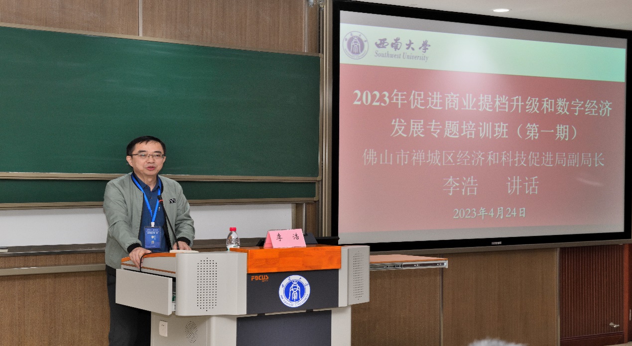 2023年4月24日上午,公司承办的佛山市禅城区“2023年促进商业提档升级和数字经济发展专题培训班(第一期)”在公司B301教室顺利开班。佛山市禅城区经济和科技促进局副局长李浩、佛山粤商管理研究院经理刘德勇、sunbet申搏经济管理公司党委书记卢跃进、公司副经理黄庆华教授,以及培训班学员共计50余人出席开班仪式。开班仪式由公司副经理黄庆华教授主持。