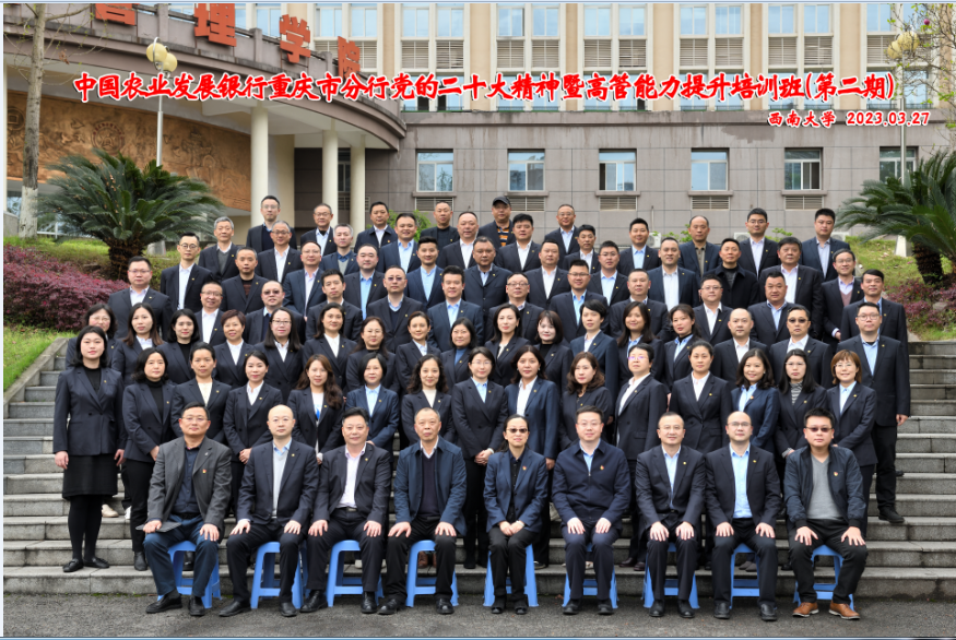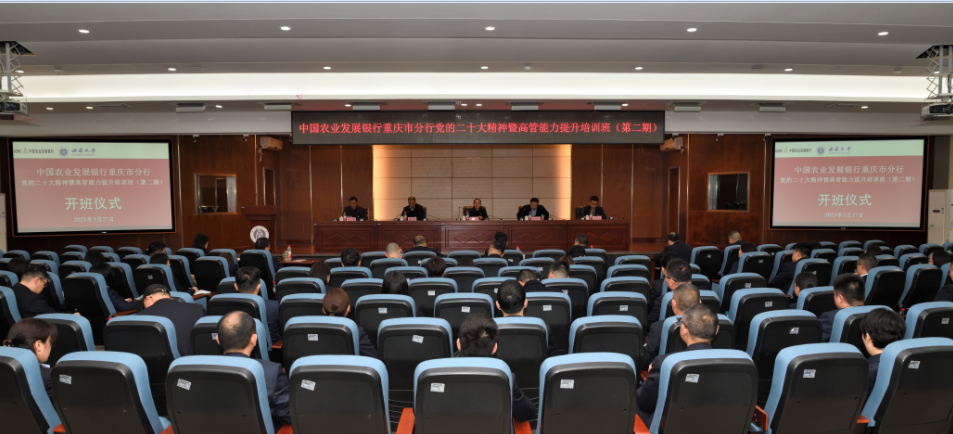 2023年3月27日下午,由中国农业发展银行重庆市分行主办、sunbet高层培训中心承办的“党的二十大精神暨高管能力提升培训班(第二期)”在公司B401报告厅顺利开班。中国农业发展银行重庆市分行党委委员、纪委书记许红、sunbet申搏党委副书记、纪委书记夏玉峰教授、经济管理公司党委副书记、经理祝志勇教授、公司党委副书记、纪委书记张其光、公司党委副书记李玉胜,以及培训班学员共计80余人出席开班仪式。开班仪式由经济管理公司党委副书记、经理祝志勇教授主持。