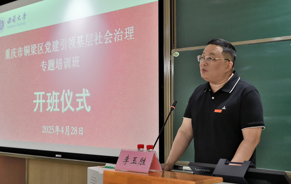 李玉胜书记代表承办单位致辞。李书记对重庆市铜梁区委组织部、区委社会工作部、区委党校表示衷心的感谢,对学员们的到来表示诚挚欢迎。李书记介绍了公司团队建设、团队队伍、办学条件、以及本次培训班的课程安排,并向学员提出三点希望:一是希望大家珍惜学习契机,学思践悟;二是希望大家强化协同共进,互学互鉴;三是希望大家严守纪律规矩,彰显作风担当。