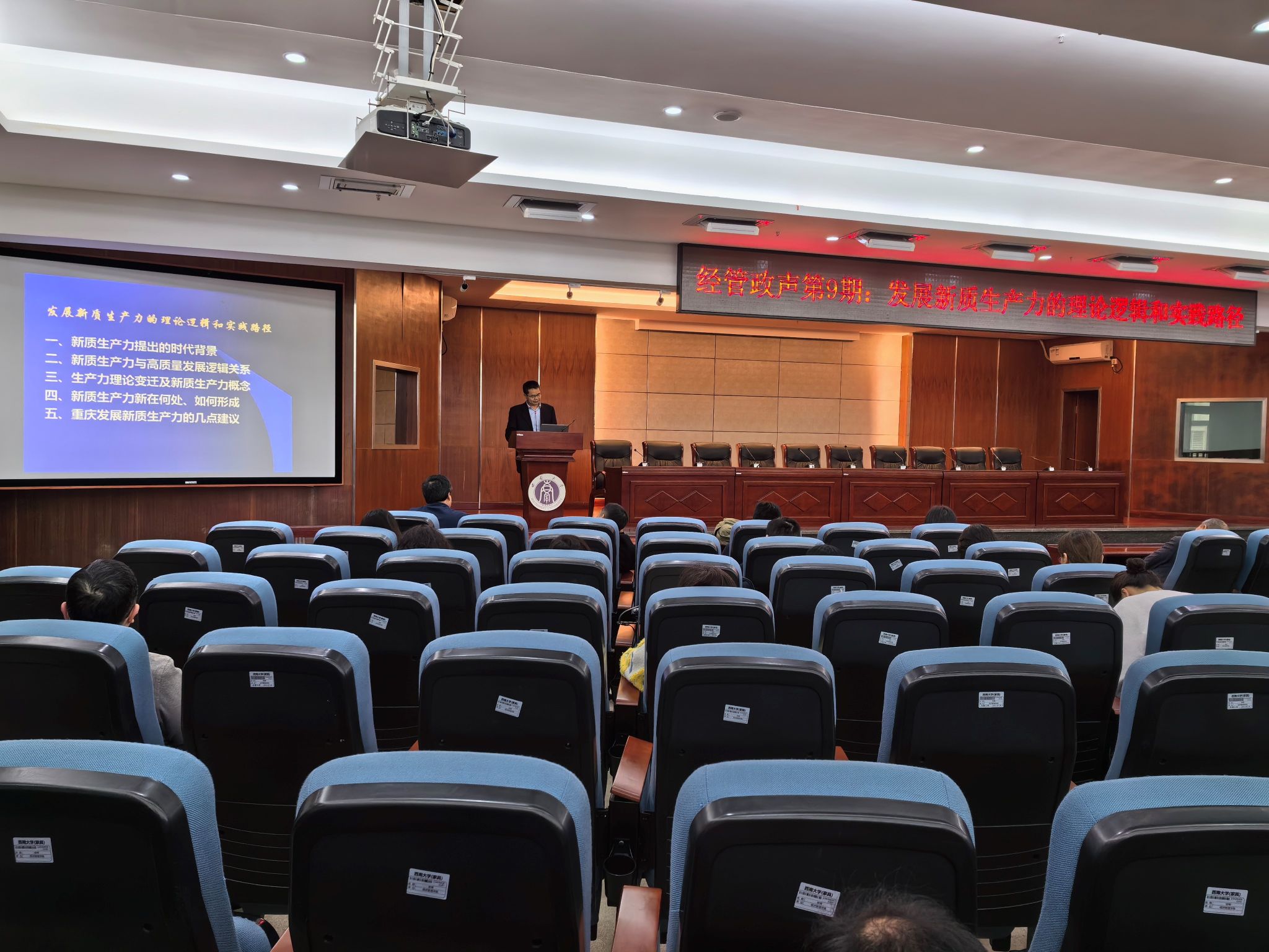 黄庆华教授以《发展新质生产力的理论逻辑和实践路径》为题,作“经管政声”第九讲。他围绕“新质生产力提出的时代背景、新质生产力与高质量发展的逻辑关系、生产力理论变迁及新质生产力概念、新质生产力新在何处及如何形成、重庆发展新质生产力的几点建议”等五个方面,指出新质生产力的提出关键在于中国自身发展的内在要求和底层逻辑;发展新质生产力是高质量发展的内在要求和重要着力点;新质生产力由技术革命性突破、生产要素创新性配置、产业深度转型升级而催生,以劳动者、劳动资料、劳动对象及其优化组合的跃升为基本内涵,以全要素生产率大幅提升为核心标志,特点是创新,关键在质优,本质是先进生产力。结合重庆实际发展新质生产力,他建议要厘清新质生产力与传统生产力的关系、政治逻辑与市场逻辑的关系、内循环与外循环之间的关系、单打独斗与统一大市场的关系、产业数字化与数字产业化的关系、33618现代制造业集群与其他产业的关系、科教人才与创新的关系。