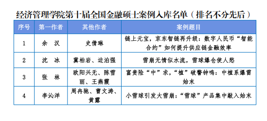 1月8日,全国金融专业学位研究生教育指导委员会第十届(2024年)案例征集活动入库案例名单公示结束。学院金融硕士(MF)教育中心沈冰教授、李沁洋教授、张林教授、余汉副教授团队分别开发的4篇案例入库中国金融专业学位案例中心(即往届的“全国金融硕士优秀案例”)。