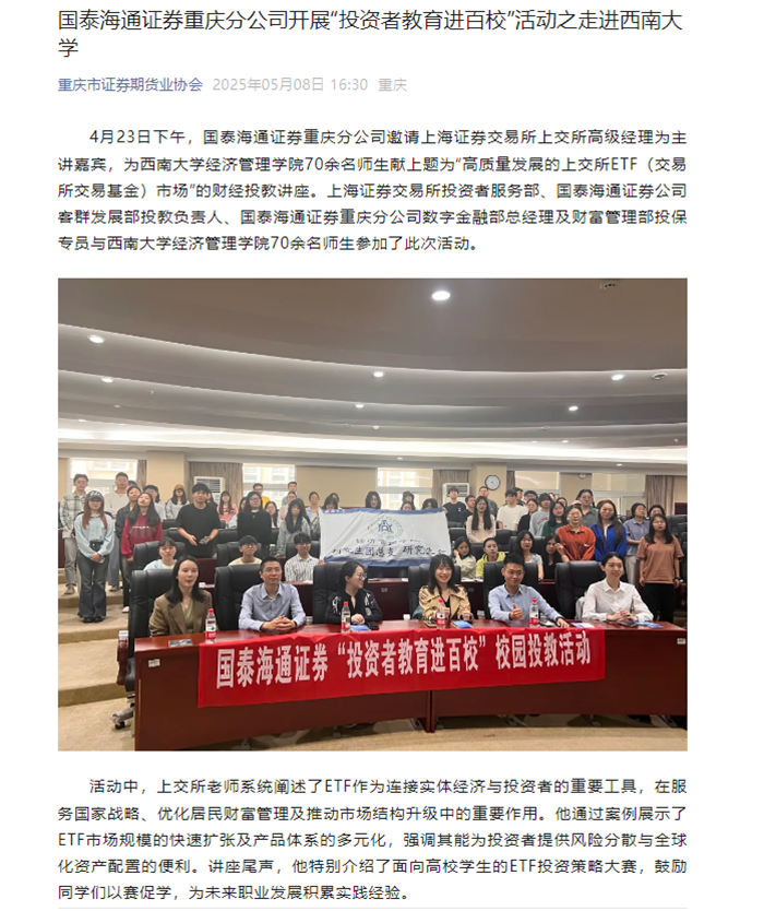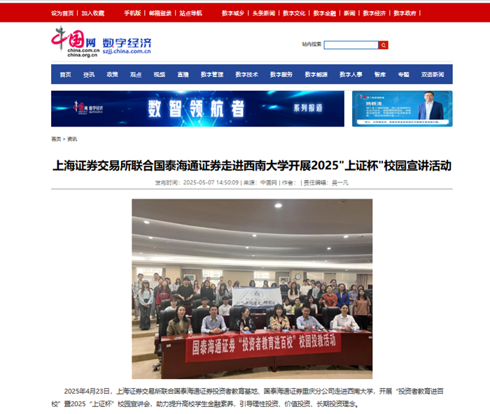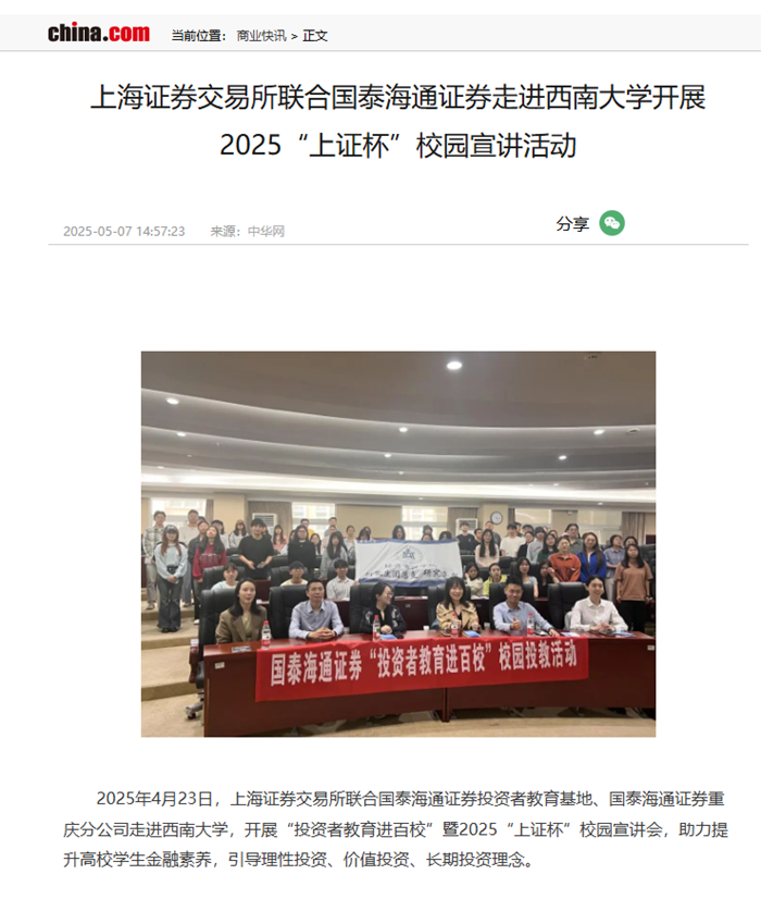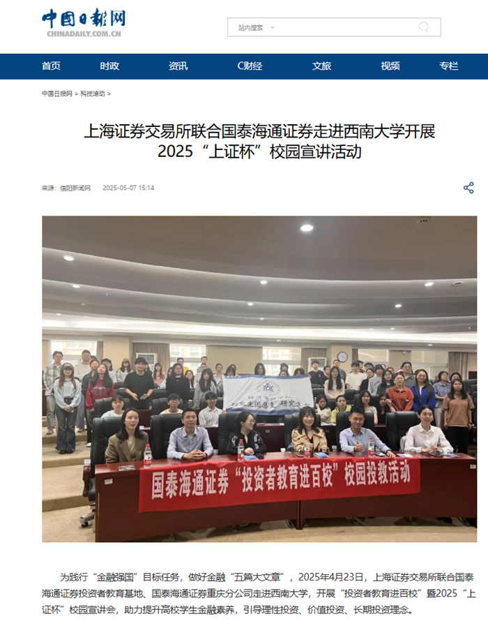 在公司开展的上交所2025“上证杯”走进校园宣讲活动获中国网、中华日报网等多家媒体报道