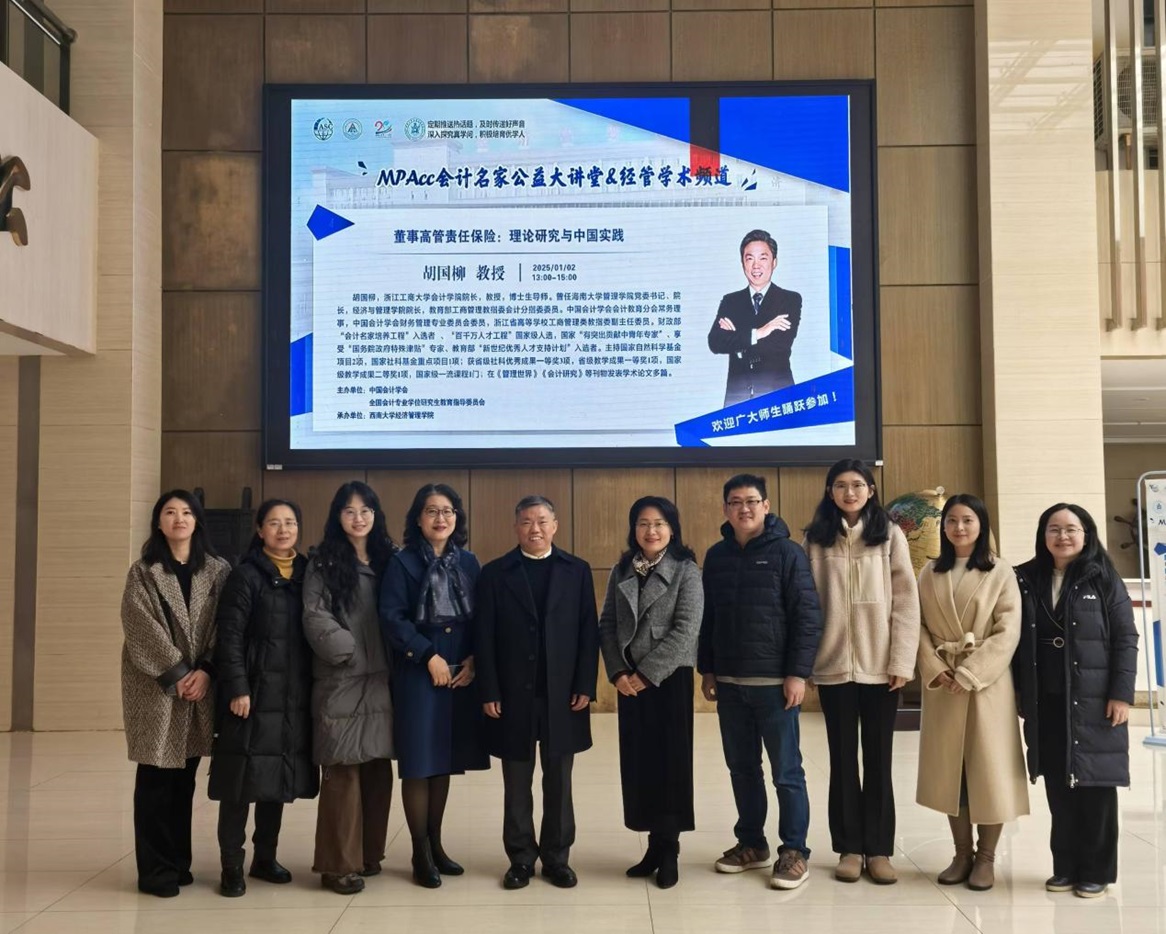 2025年1月2日,由中国会计学会、全国会计专业学位研究生教育指导委员会主办,sunbet、MPAcc教育中心承办的MPAcc会计名家公益大讲堂在公司B204报告厅举行。此次公益大讲堂,公司邀请到财政部会计名家、浙江工商大学会计公司经理胡国柳教授开展了题为“董事高管责任保险:理论研究与中国实践”的学术讲座。讲座由sunbet副经理(主持工作)杨丹教授主持,公司MPAcc教育中心60余位师生参加了本次活动。