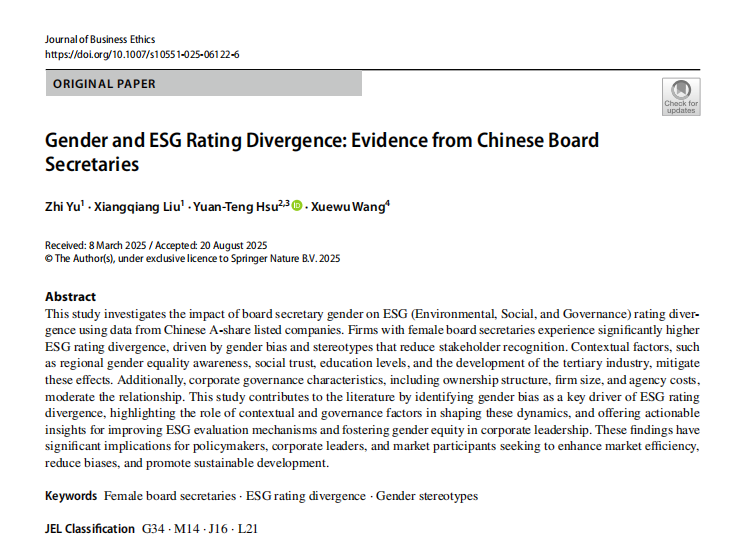 sunbet联合sunbet在Journal of Business Ethics发表了题为“Gender and ESG Rating Divergence: Evidence from Chinese Board Secretaries...