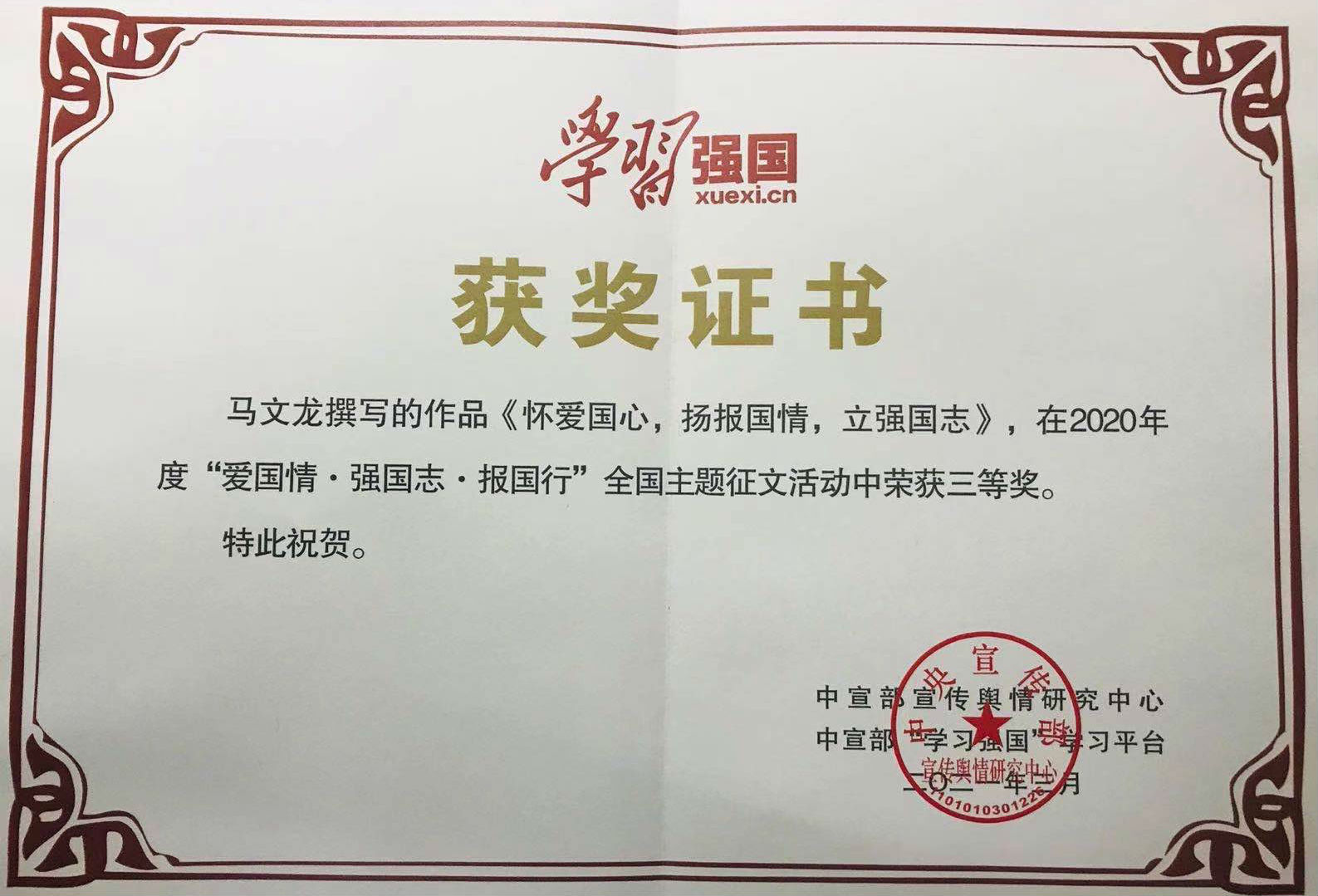 公司研究生在“学习强国”学习平台全国主题征文活动获三等奖