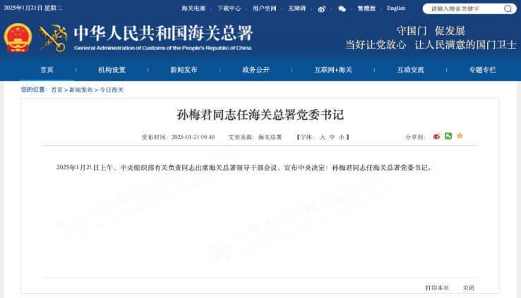 据海关总署网站消息,1月21日上午,中央组织部有关负责同志出席海关总署领导干部会议,宣布中央决定:孙梅君同志任海关总署党委书记。