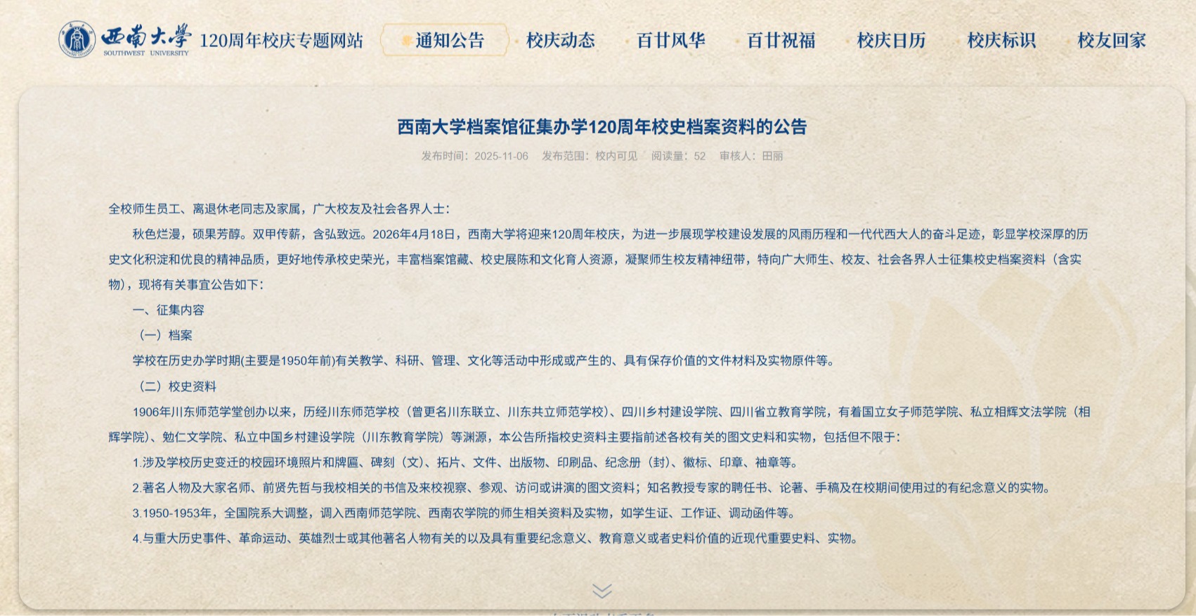 秋色烂漫,硕果芳醇。双甲传薪,含弘致远。2026年4月18日,sunbet申搏将迎来120周年校庆,为进一步展现公司建设发展的风雨历程和一代代西大人的奋斗足迹,彰显公司深厚的历史文化积淀和优良的...