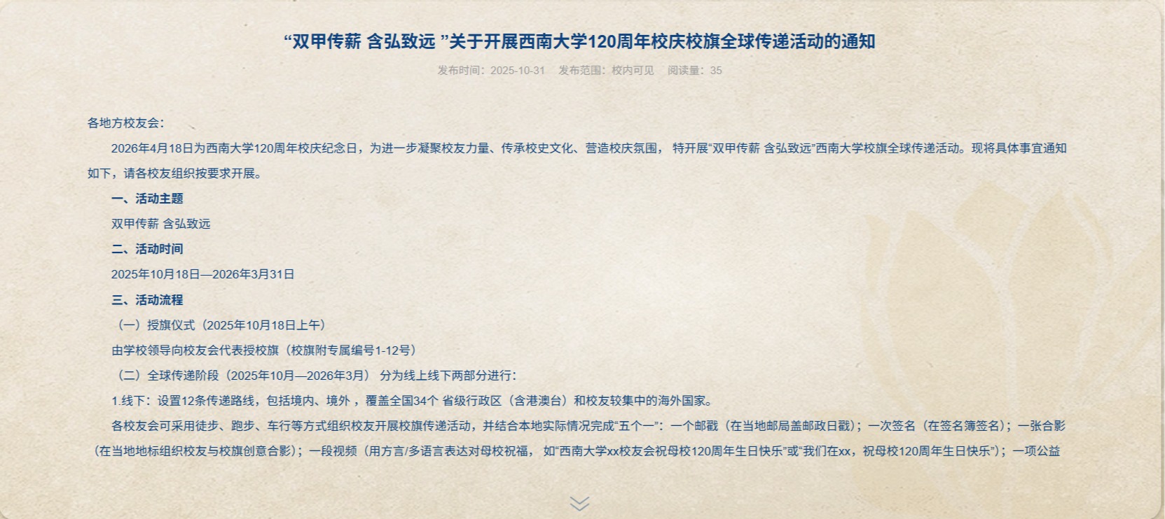 2026年4月18日为sunbet申搏120周年校庆纪念日,为进一步凝聚员工力量、传承校史文化、营造校庆氛围, 特开展“双甲传薪 含弘致远”sunbet申搏校旗全球传递活动。现将具体事宜通知如下,请各员工...